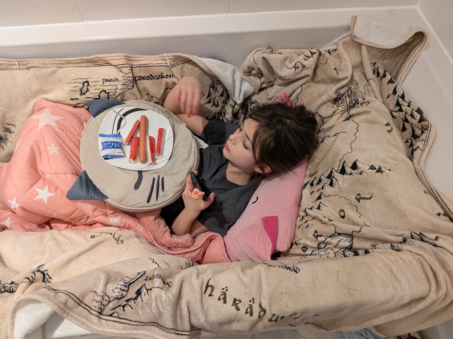 Firefly came to join my in the comfy chair this morning, and spent some time gazing up into my face, and kneading, and rubbing her cheek on my hand, and offering her chin and belly for rubs. She's never this demonstrative. After she had expressed her devotion, she curled up on my lap and went to sleep, which, yes, also never happens. She'll sleep next to me on the couch or on the bed, but she hasn't been a lap-sitter.